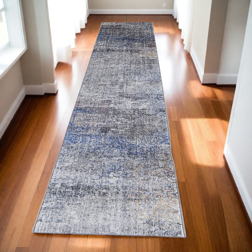 10' Blue and Ivory Abstract Power Loom Distressed Runner Rug