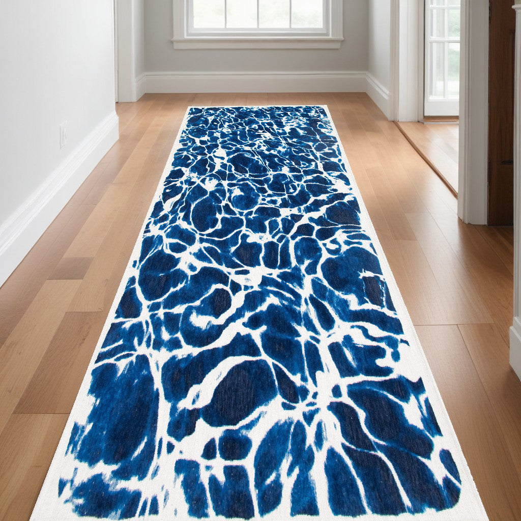 Add some artistry to your room with this 10-foot blue and white abstract non skid area rug....
