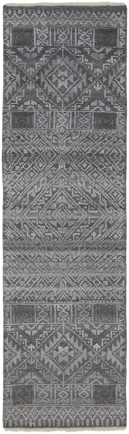 10' Gray Ivory and Blue Geometric Hand Knotted Runner Rug With Fringe