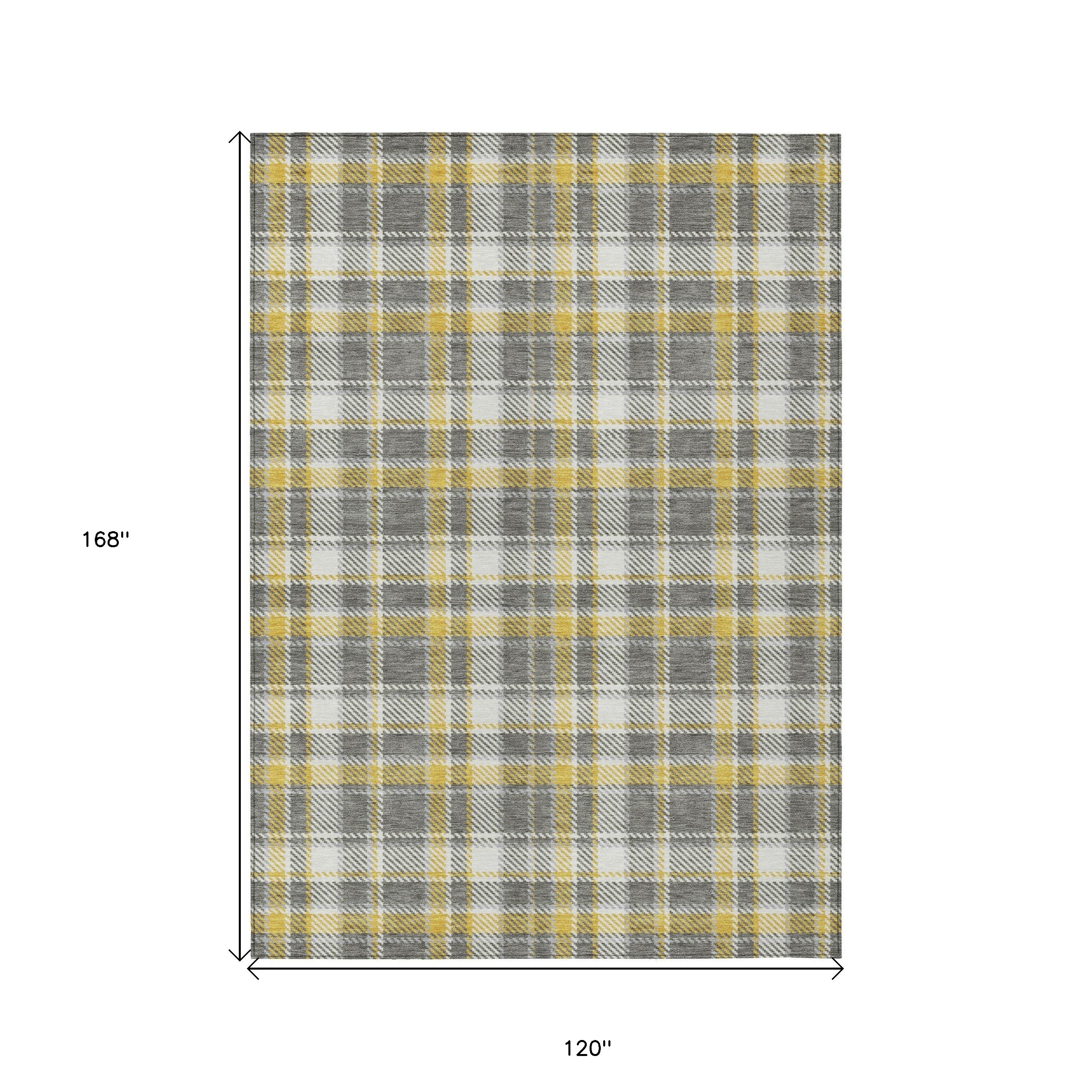 10' X 14' Gray Yellow and White Plaid Washable Non Skid Indoor Outdoor Area Rug