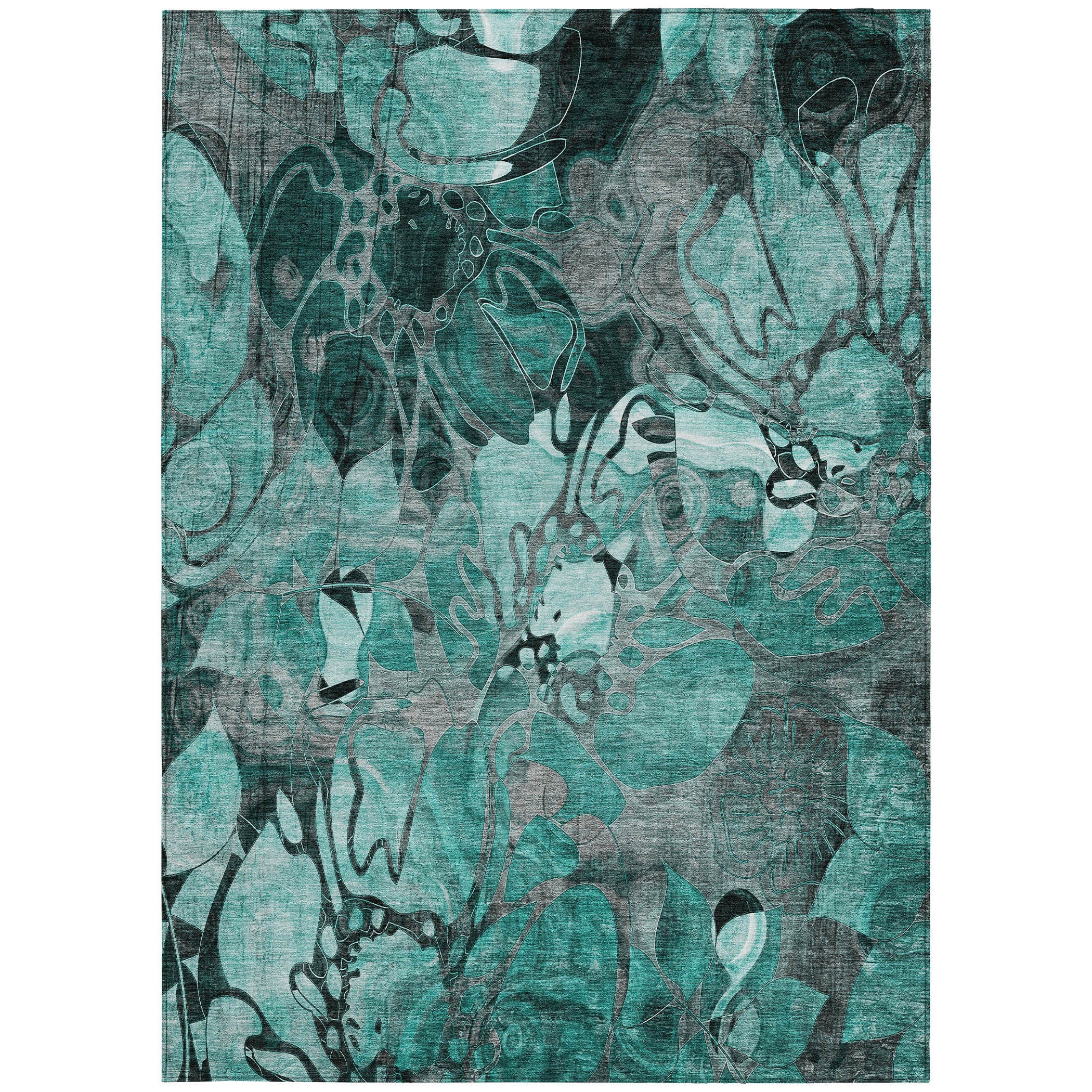 10' X 14' Teal Black and Gray Floral Washable Non Skid Indoor Outdoor Area Rug