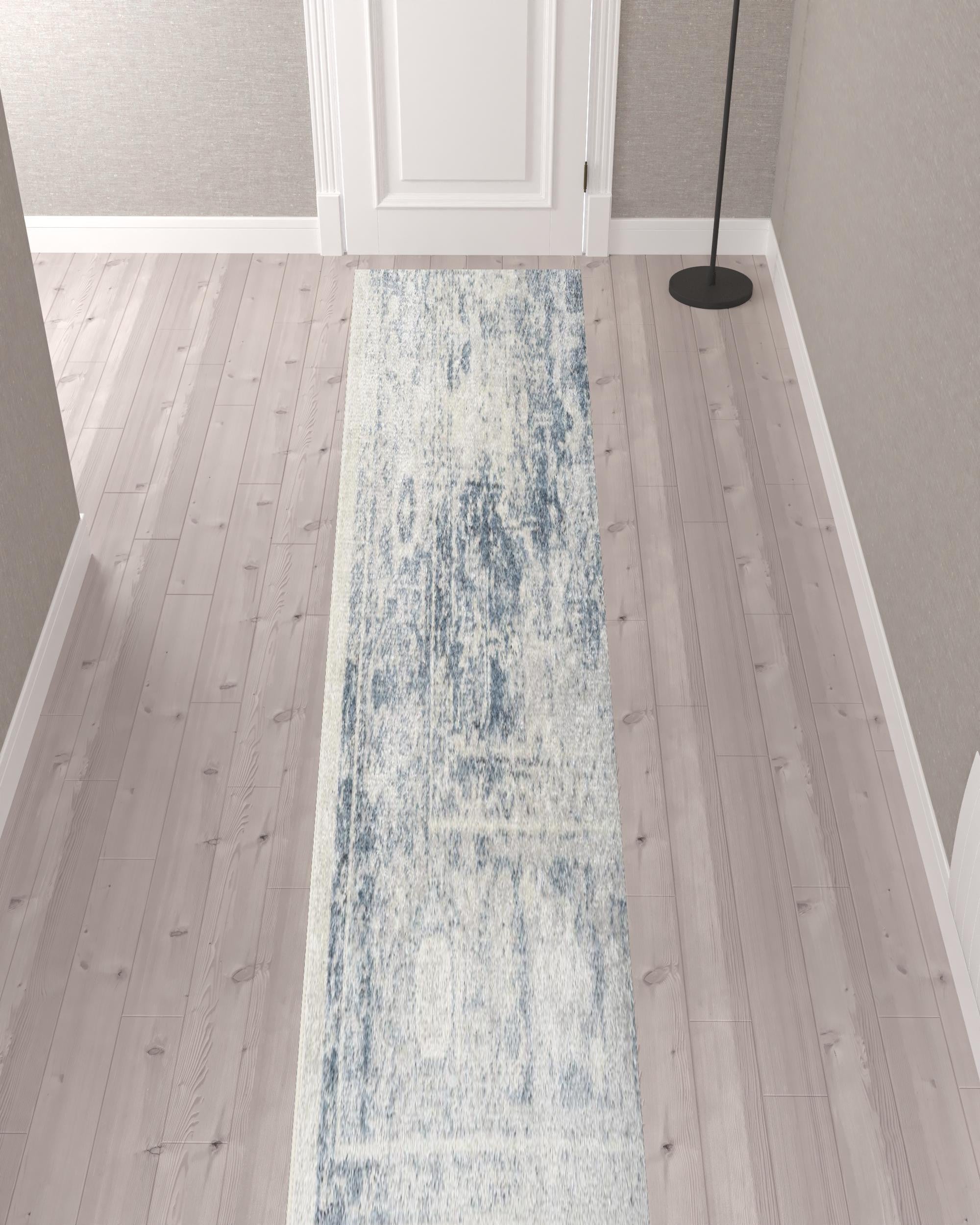 12' Blue Oriental Power Loom Distressed Washable Runner Rug