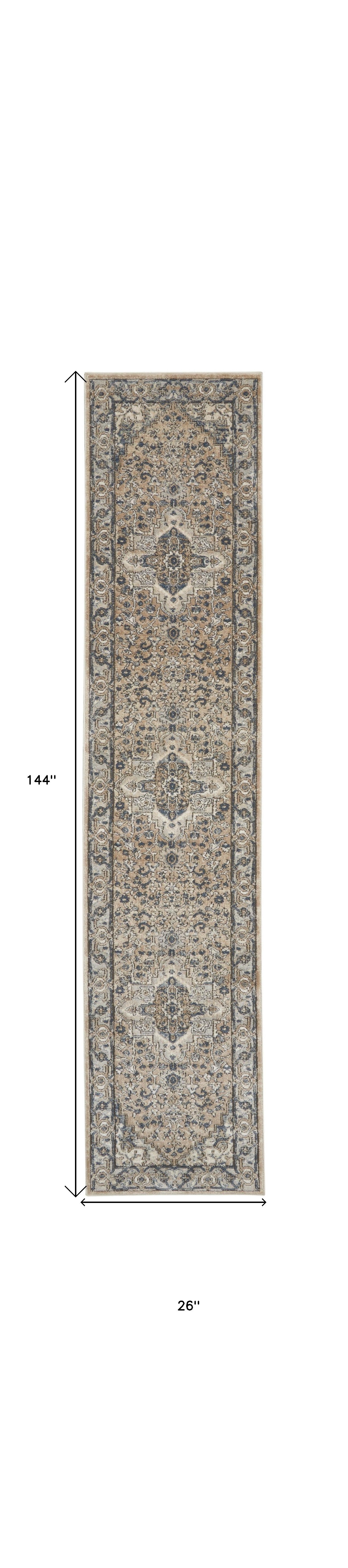 12' Gray and Ivory Medallion Power Loom Runner Rug