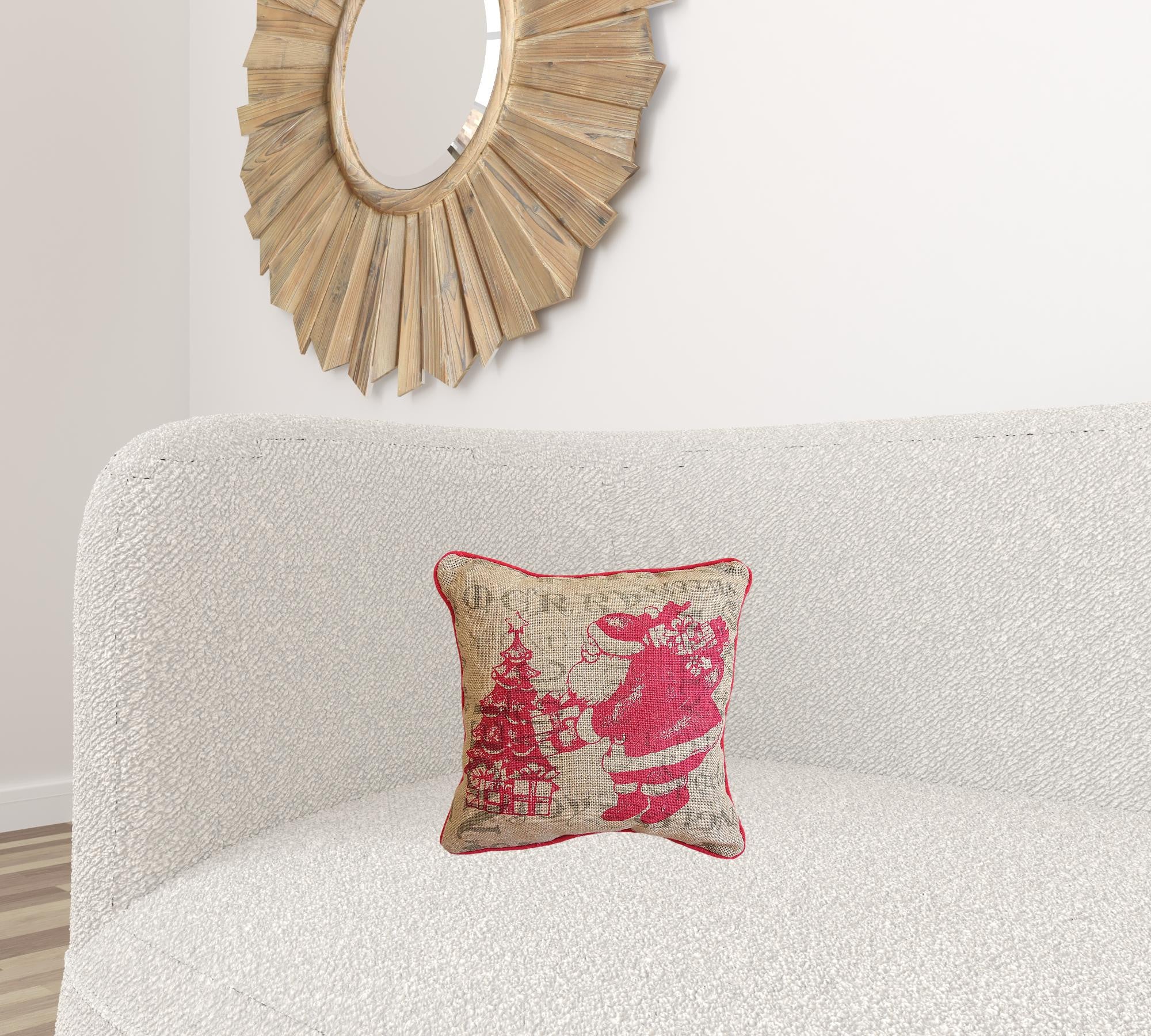 14" X 14" Beige and Red Christmas Santa Jute Pillow