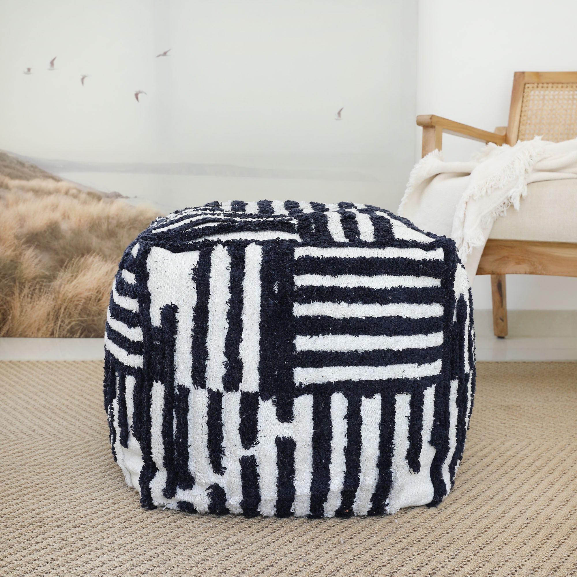 Get ready to relax with this 18-inch blue cotton cube striped pouf ottoman. Add chic style to...