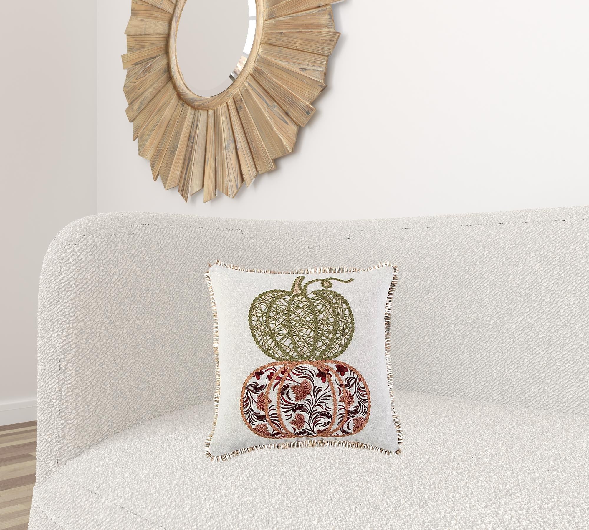 18" Ivory Green and Red Thanksgiving Cotton Pillow With Applique, Embroidery Edges