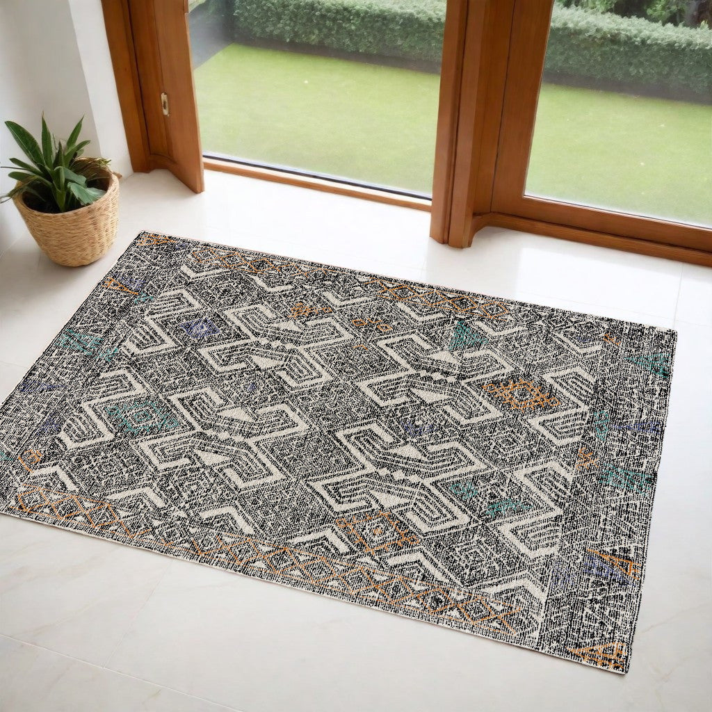 2' x 3' Black and Ivory Wool Chevron Hand Tufted Distressed Area Rug