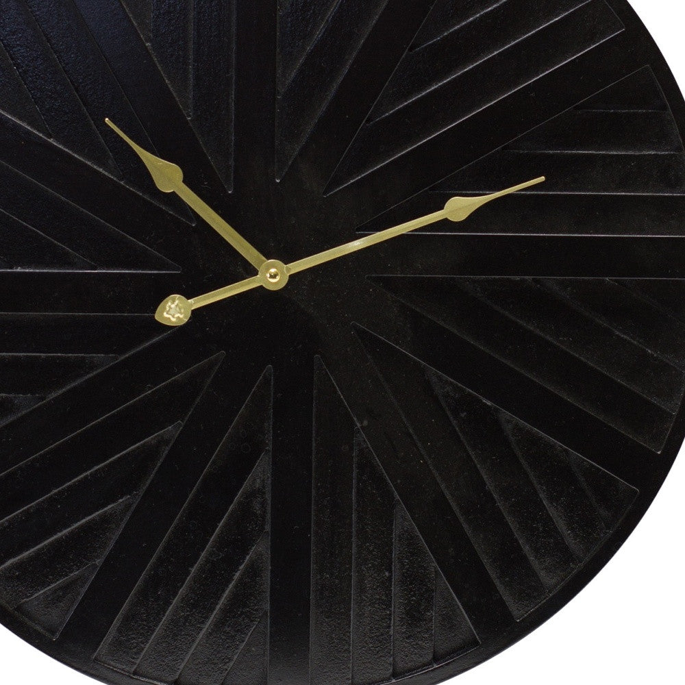 This 20-inch circle black wood and solid wood analog wall clock includes three moving hands on the...