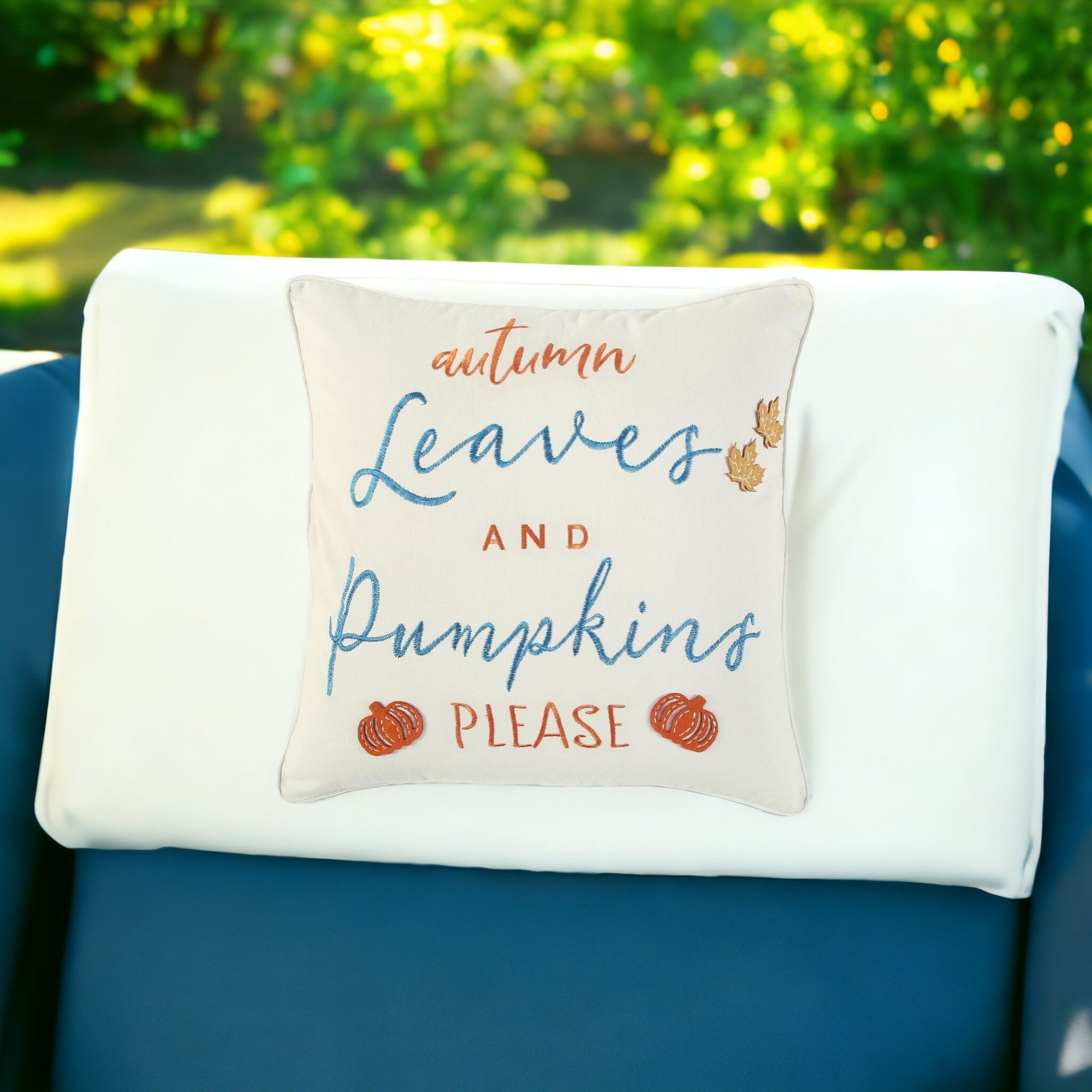 20" Ivory Blue and Orange Thanksgiving Cotton Pillow With Applique, Embroidery Edges