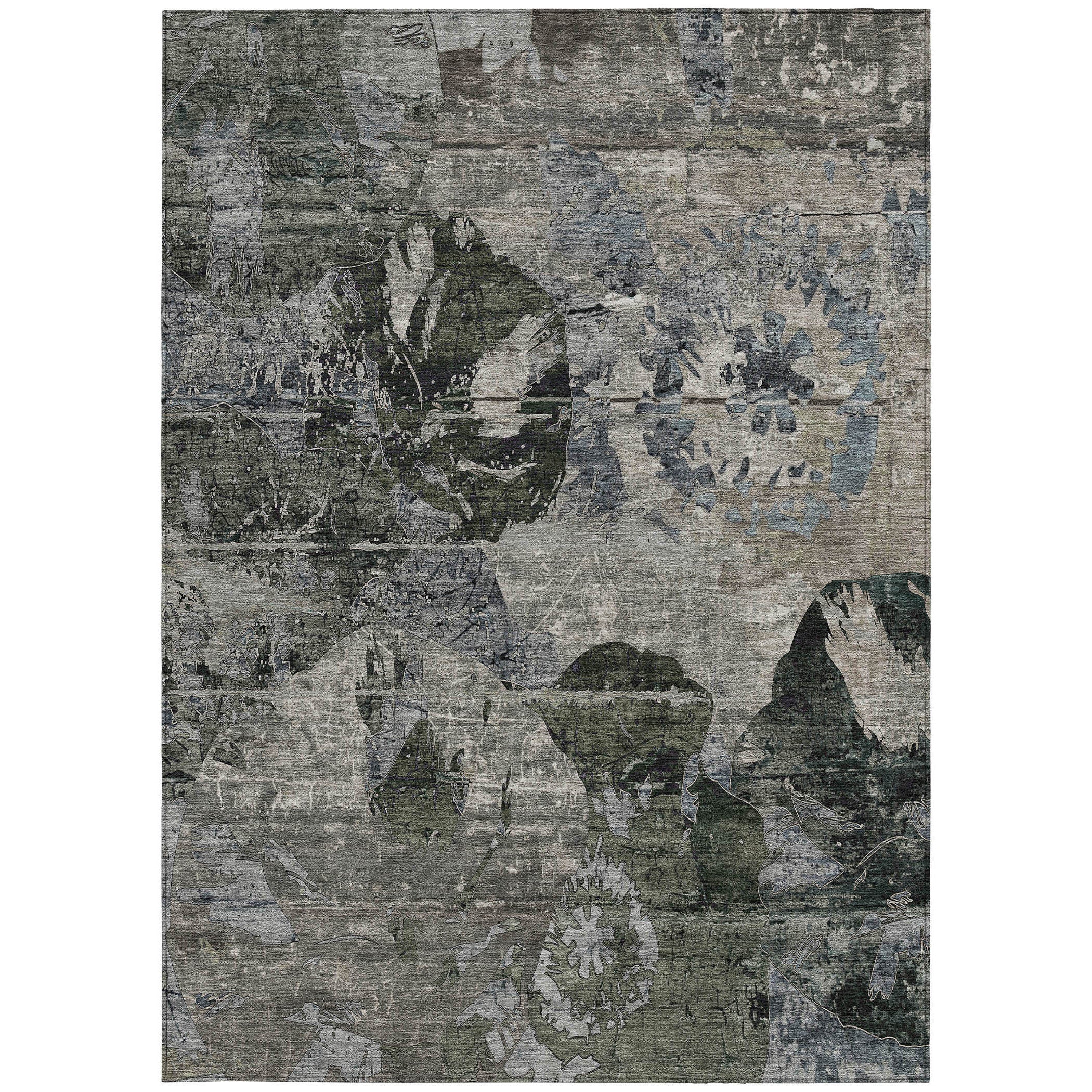 3' X 5' Gray Dark Green and Black Floral Washable Non Skid Indoor Outdoor Area Rug