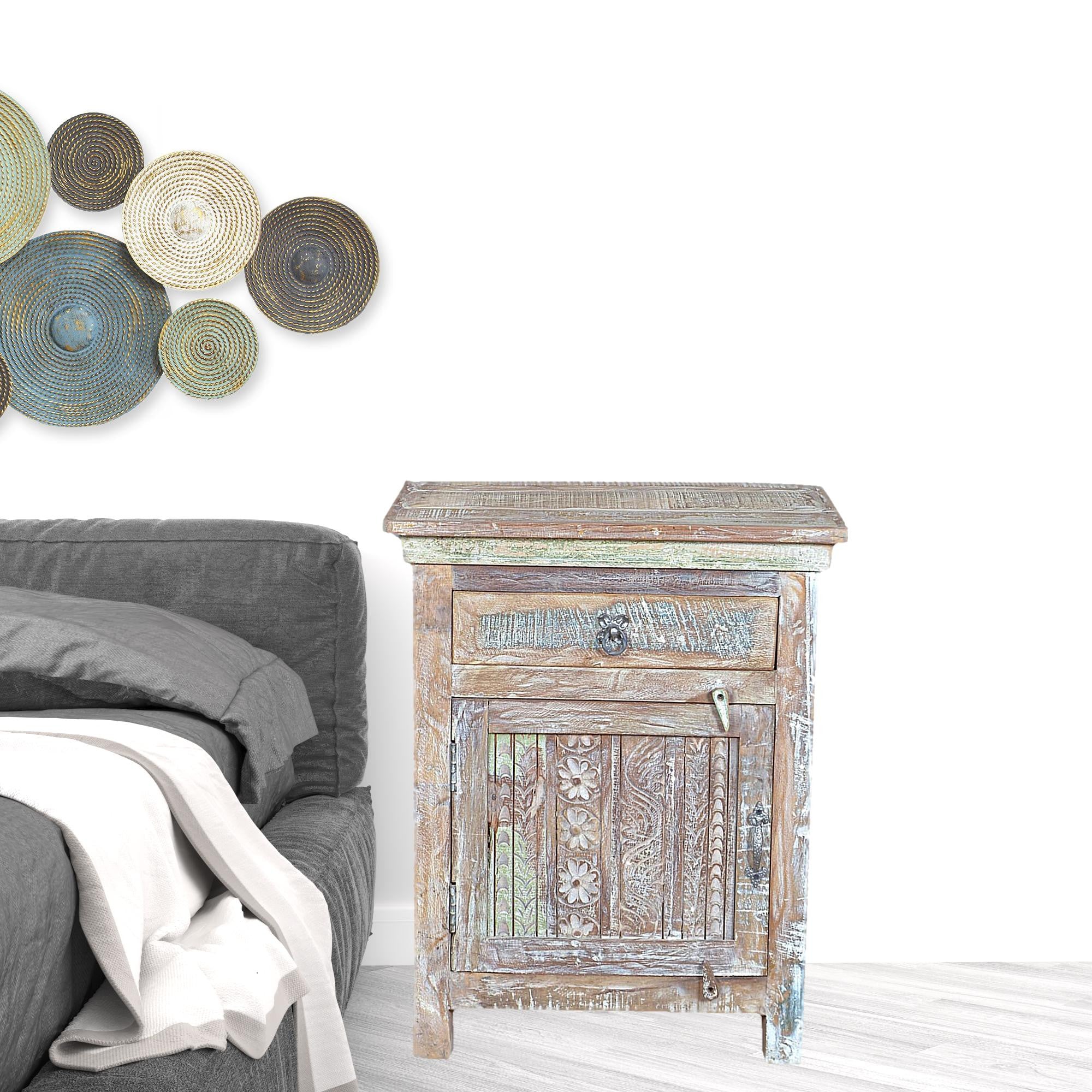30" Distressed White One Drawer Embossed Floral Solid Wood Nightstand