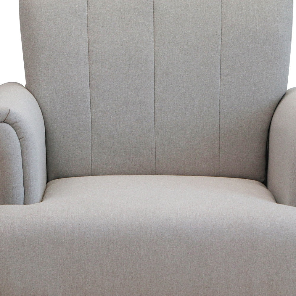 Unique and decorative, this 30-inch light gray and brown upholstered arm chair will leave a lasting impression....
