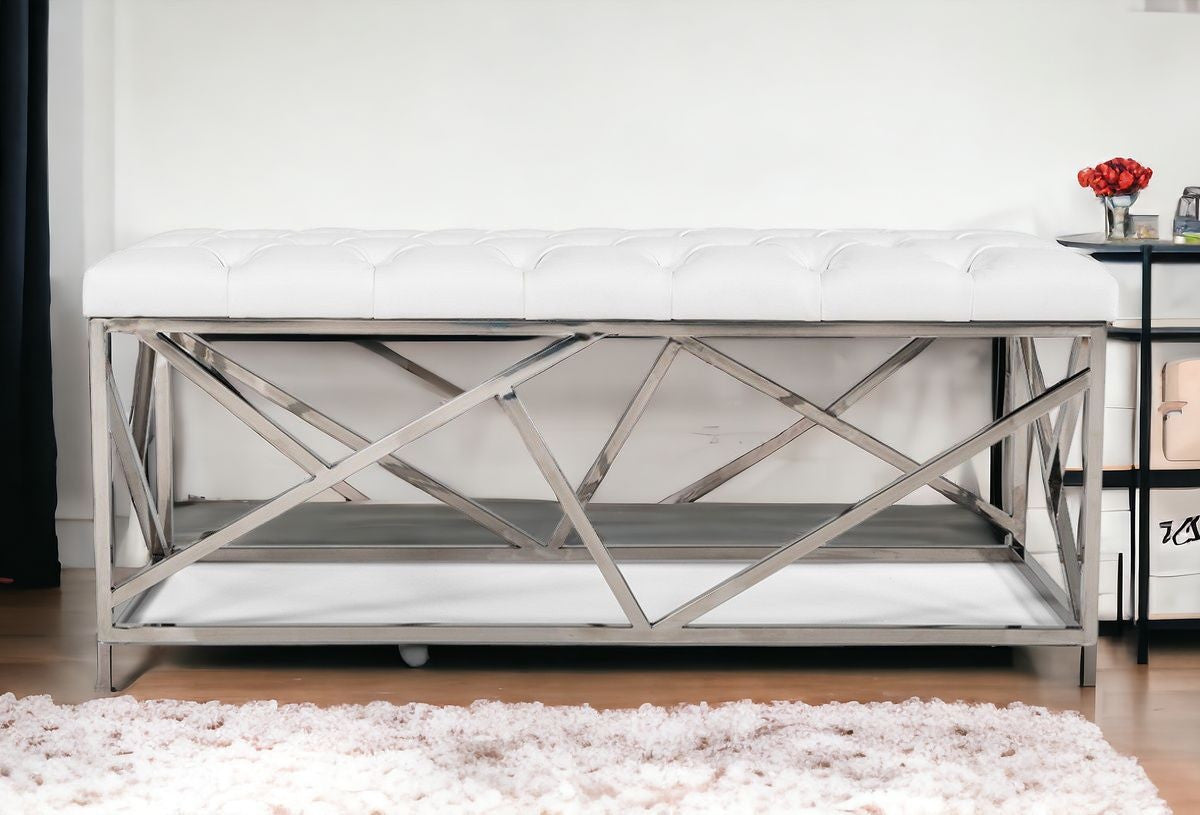 48" White and Silver Upholstered Faux Leather Bench