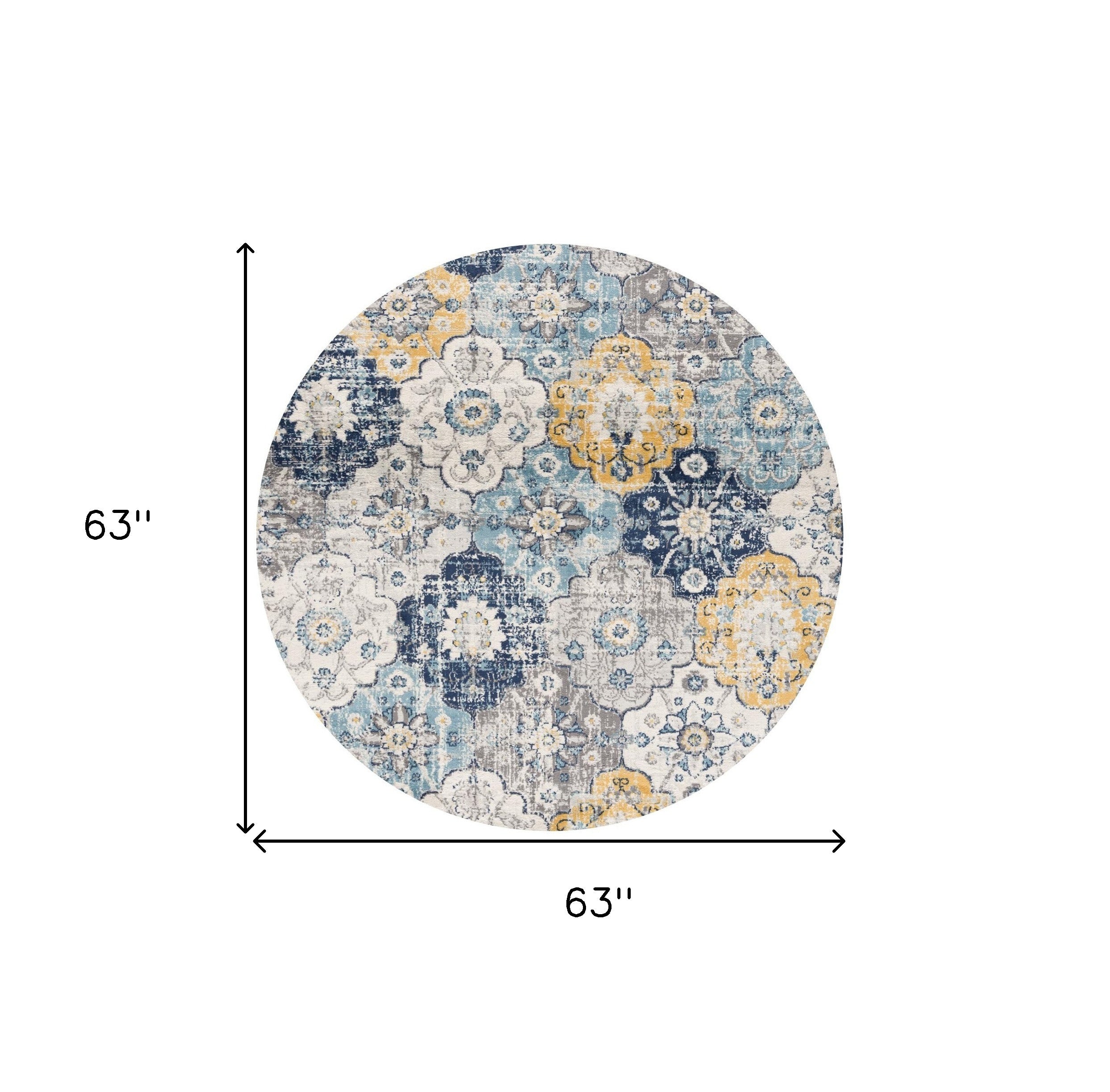 5' Blue and Gray Round Geometric Washable Non Skid Area Rug