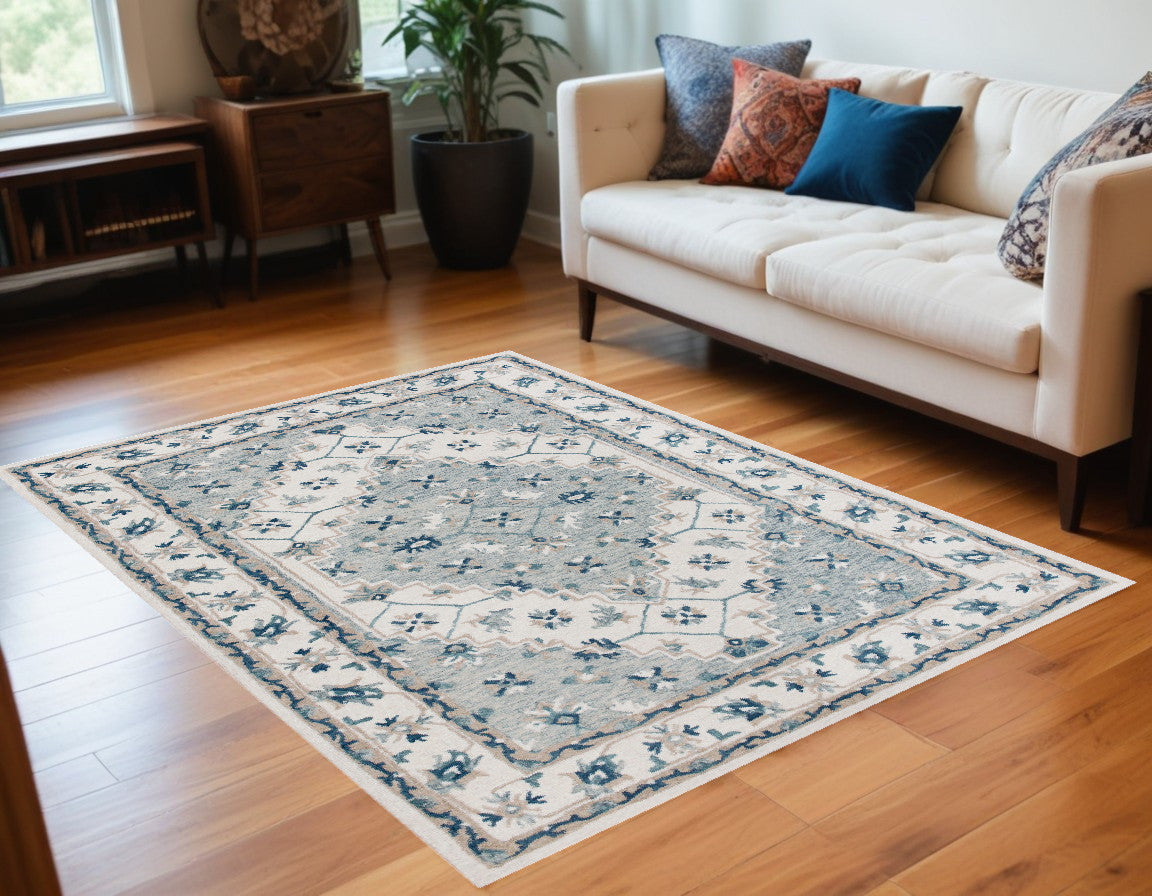 5' x 8' Blue and Ivory Wool Floral Hand Tufted Area Rug