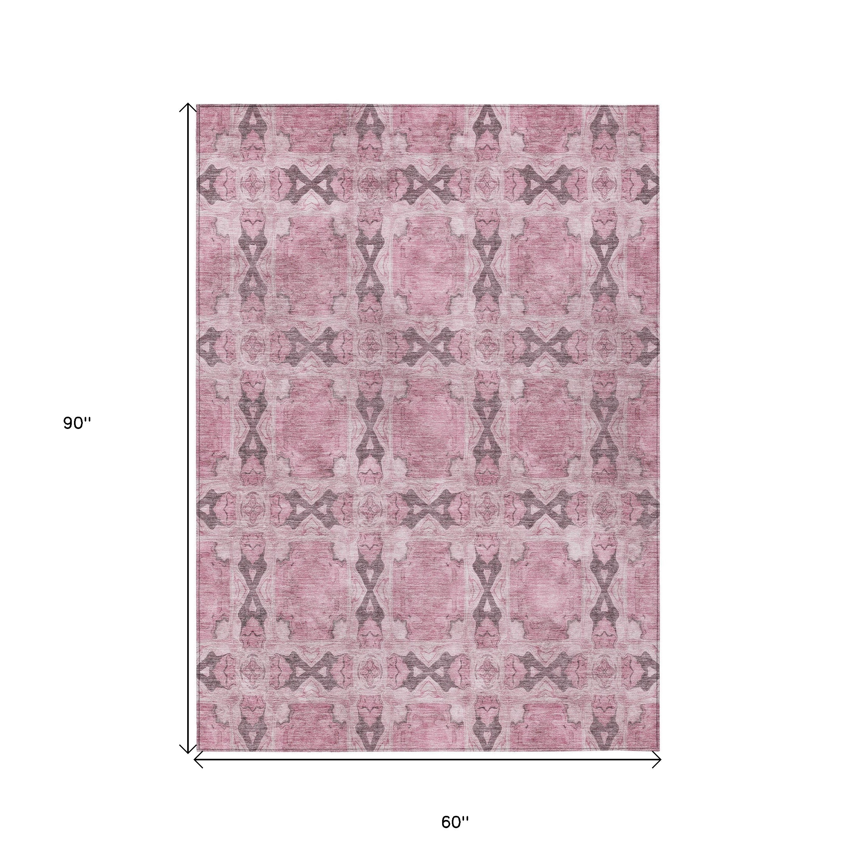 5' X 8' Pink Floral Medallion Washable Non Skid Indoor Outdoor Area Rug