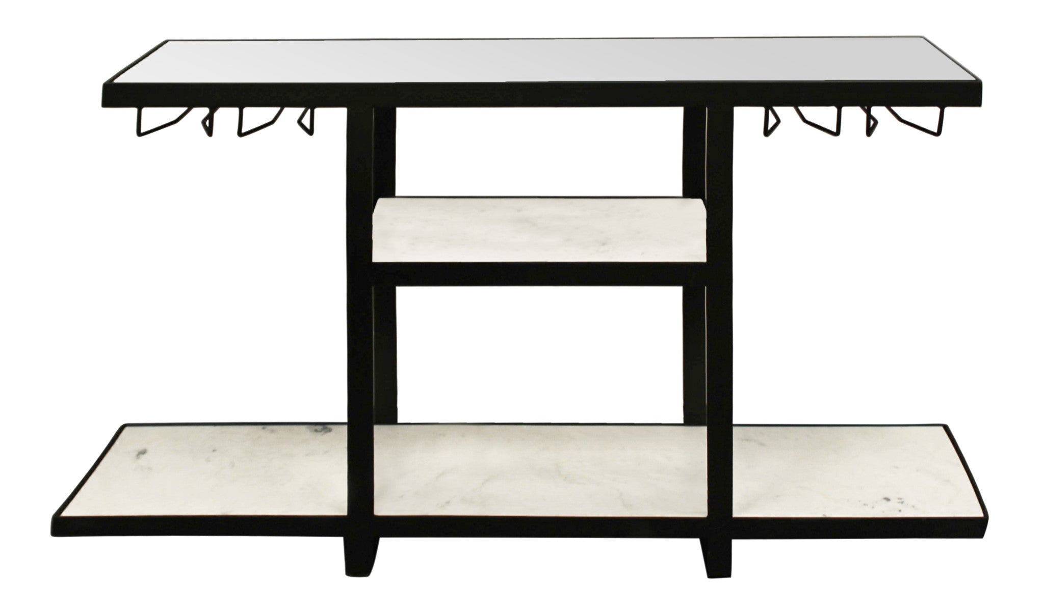 Transform your home with our elegant and versatile 58-inch white and black glass floor shelf console table...