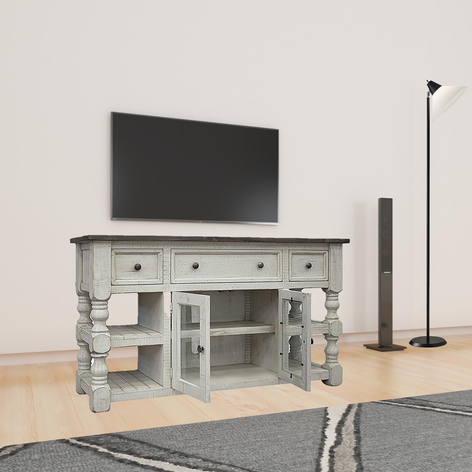 60" Ivory Solid Wood Open shelving Distressed TV Stand