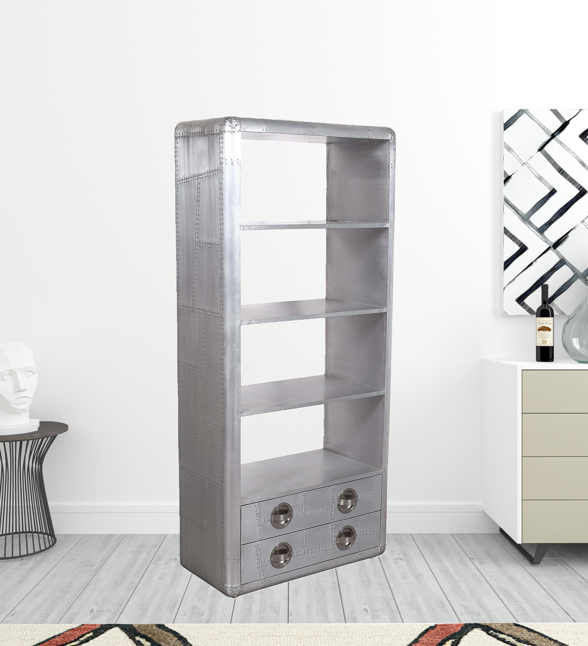 71" Silver Aluminum and Metal Four Tier Bookcase with Two Drawers