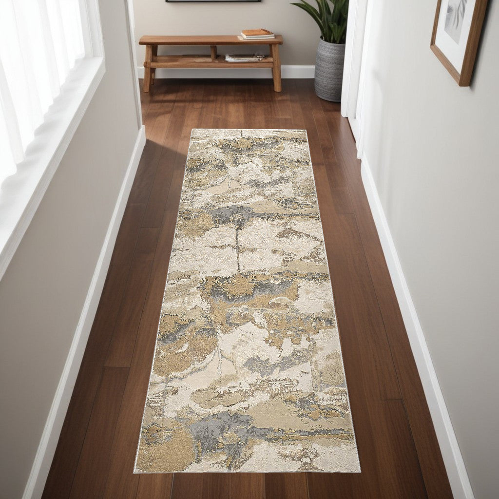 8' Gold and Ivory Abstract Power Loom Runner Rug