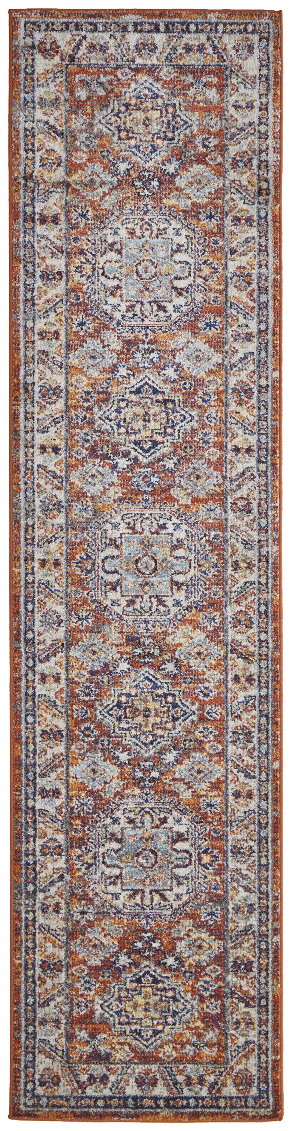 Set an inviting tone in your space with this 8-foot ivory blue and orange medallion runner rug....