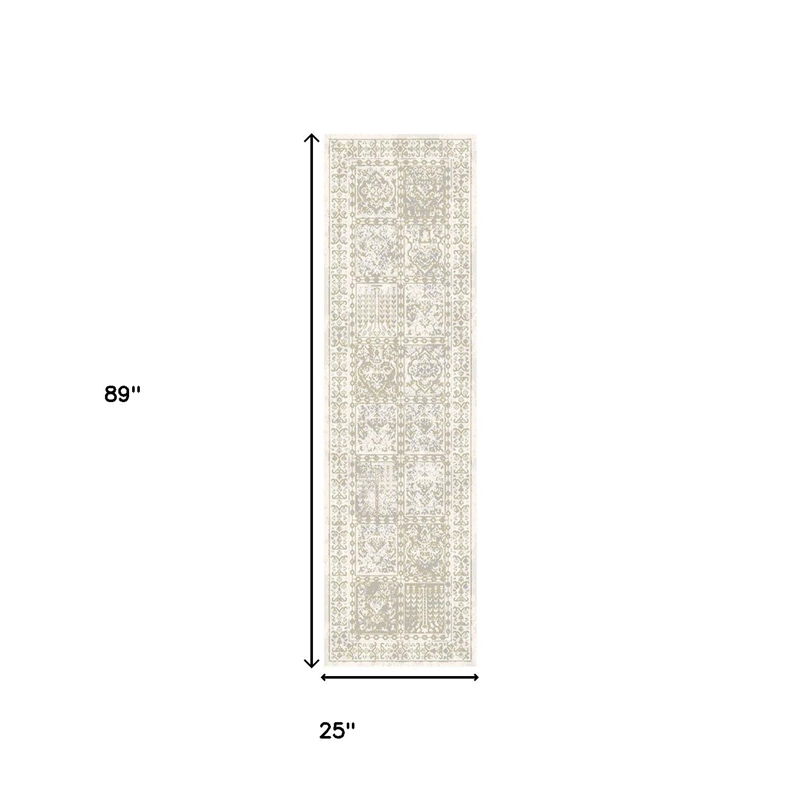 8' Ivory Oriental Distressed Runner Rug With Fringe