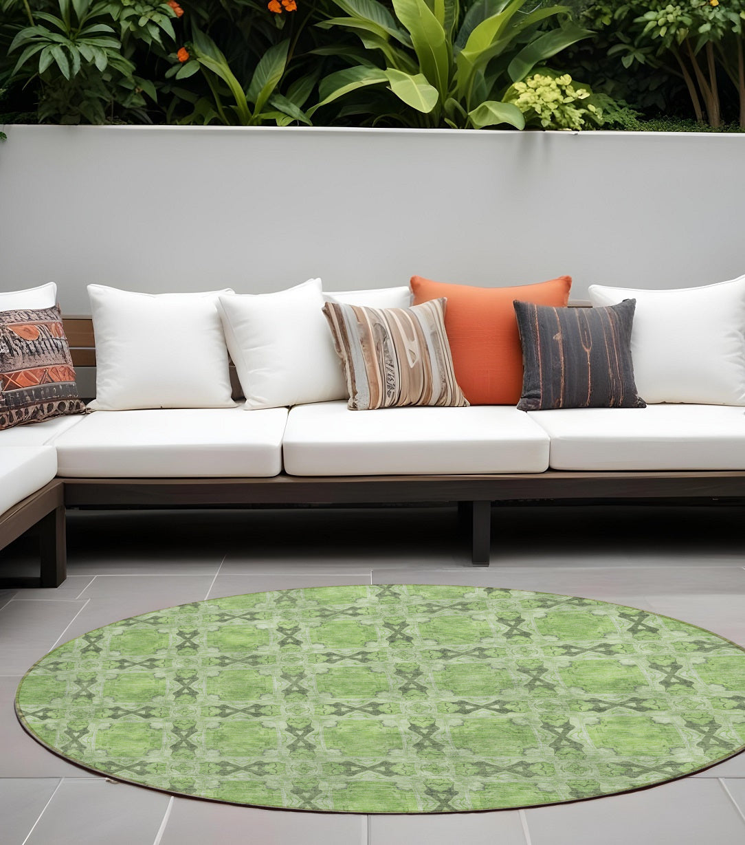 8' Round Green Round Floral Medallion Washable Non Skid Indoor Outdoor Area Rug