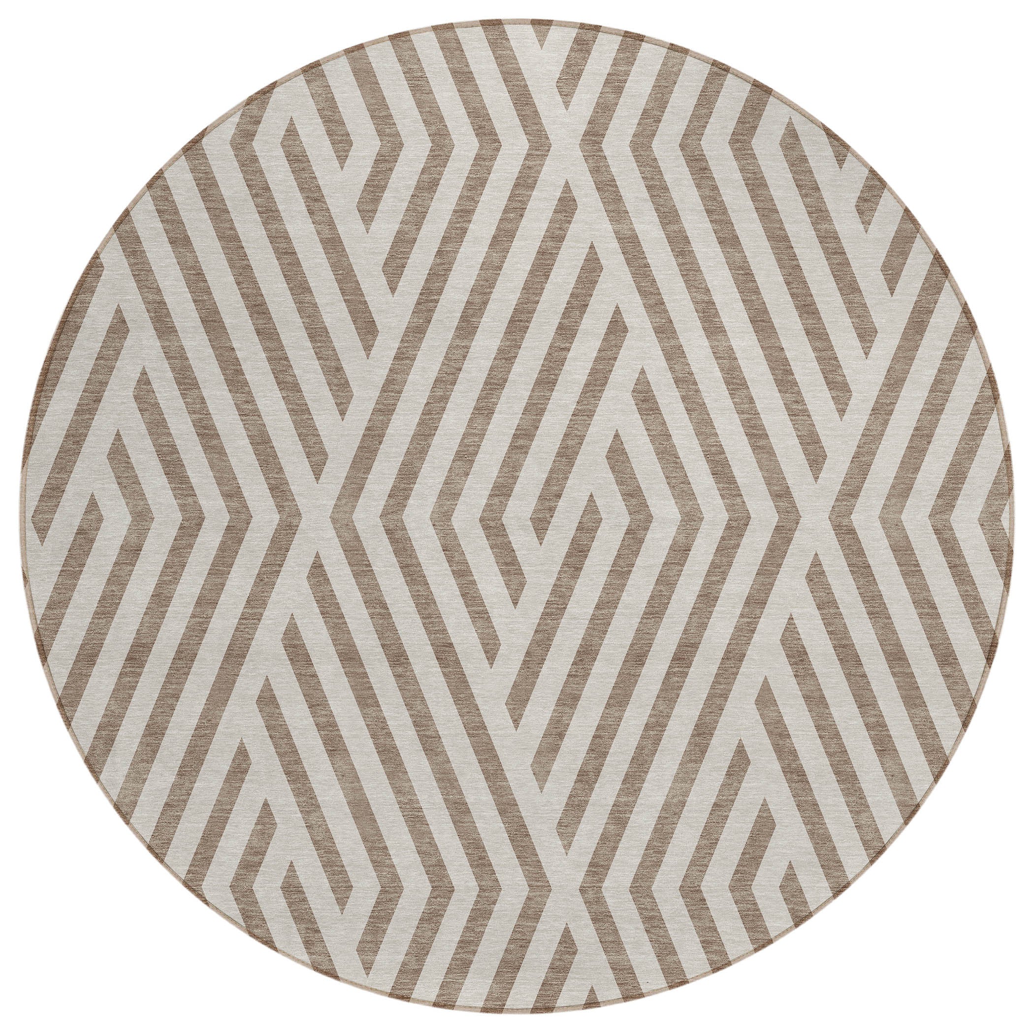 8' Round Taupe and Ivory Round Geometric Washable Non Skid Indoor Outdoor Area Rug