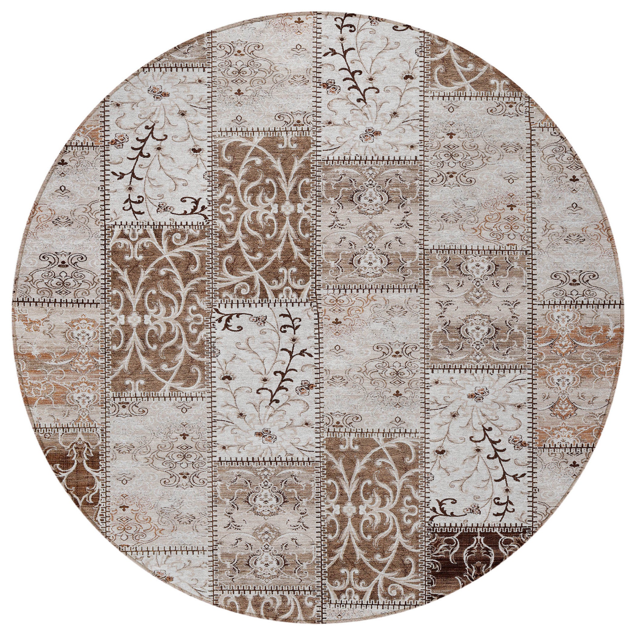 8' Round Taupe and Ivory Round Patchwork Washable Non Skid Indoor Outdoor Area Rug