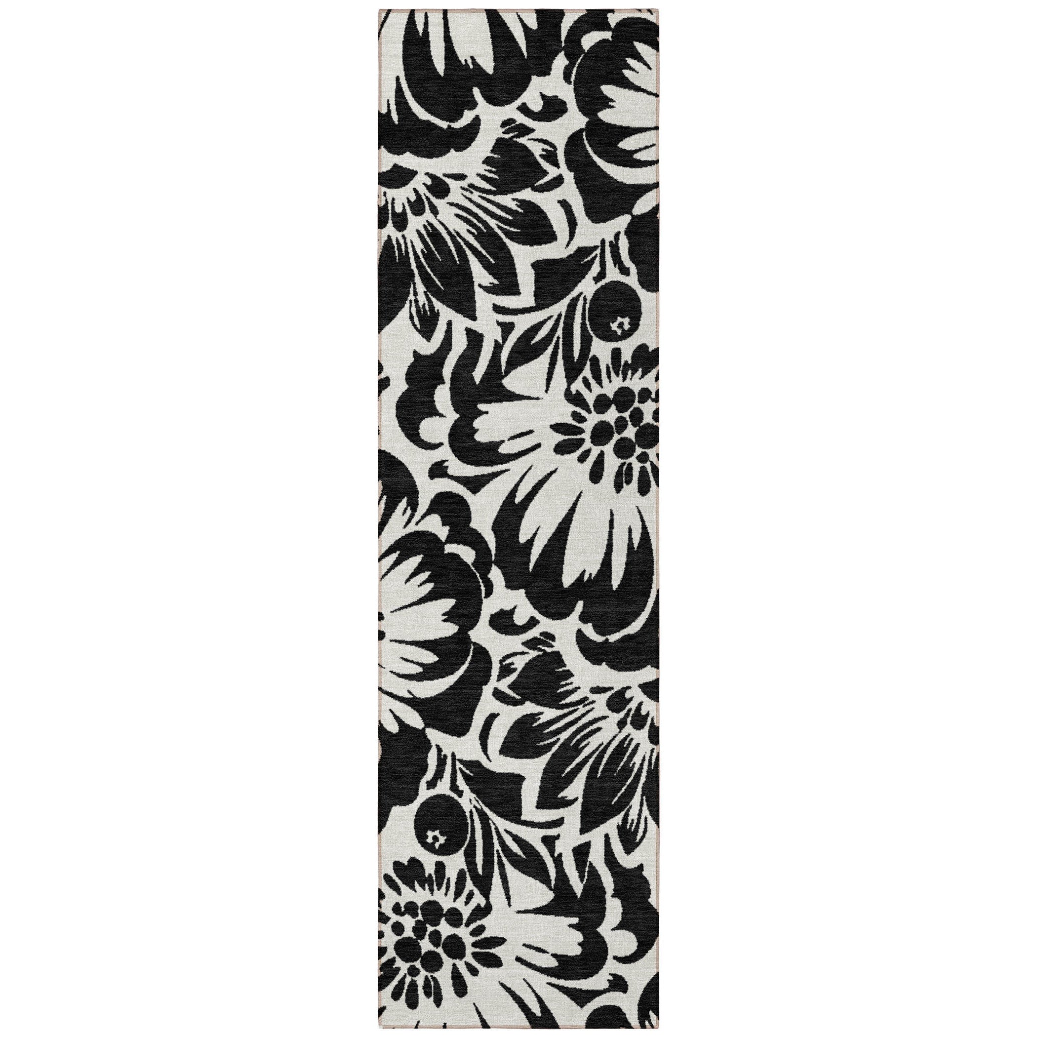 8' Runner Black and Ivory Floral Washable Non Skid Indoor Outdoor Runner Rug