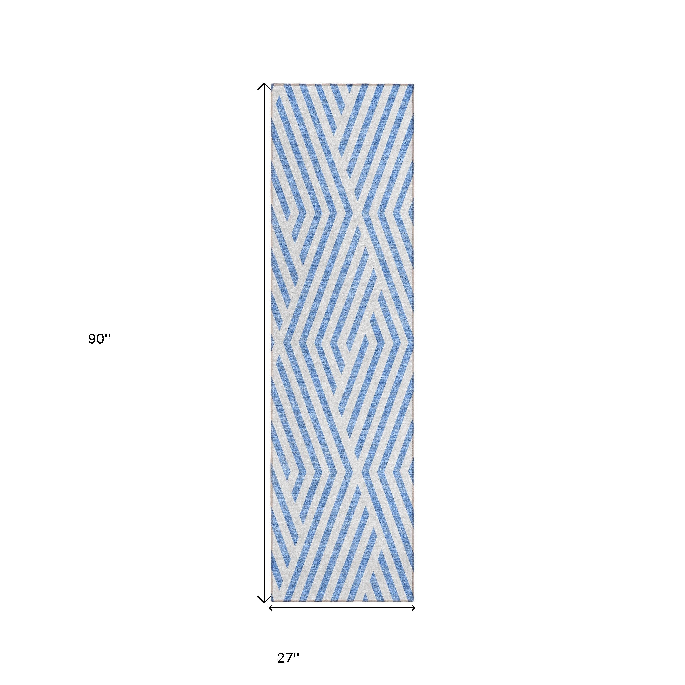 8' Runner Blue and Ivory Geometric Washable Non Skid Indoor Outdoor Runner Rug