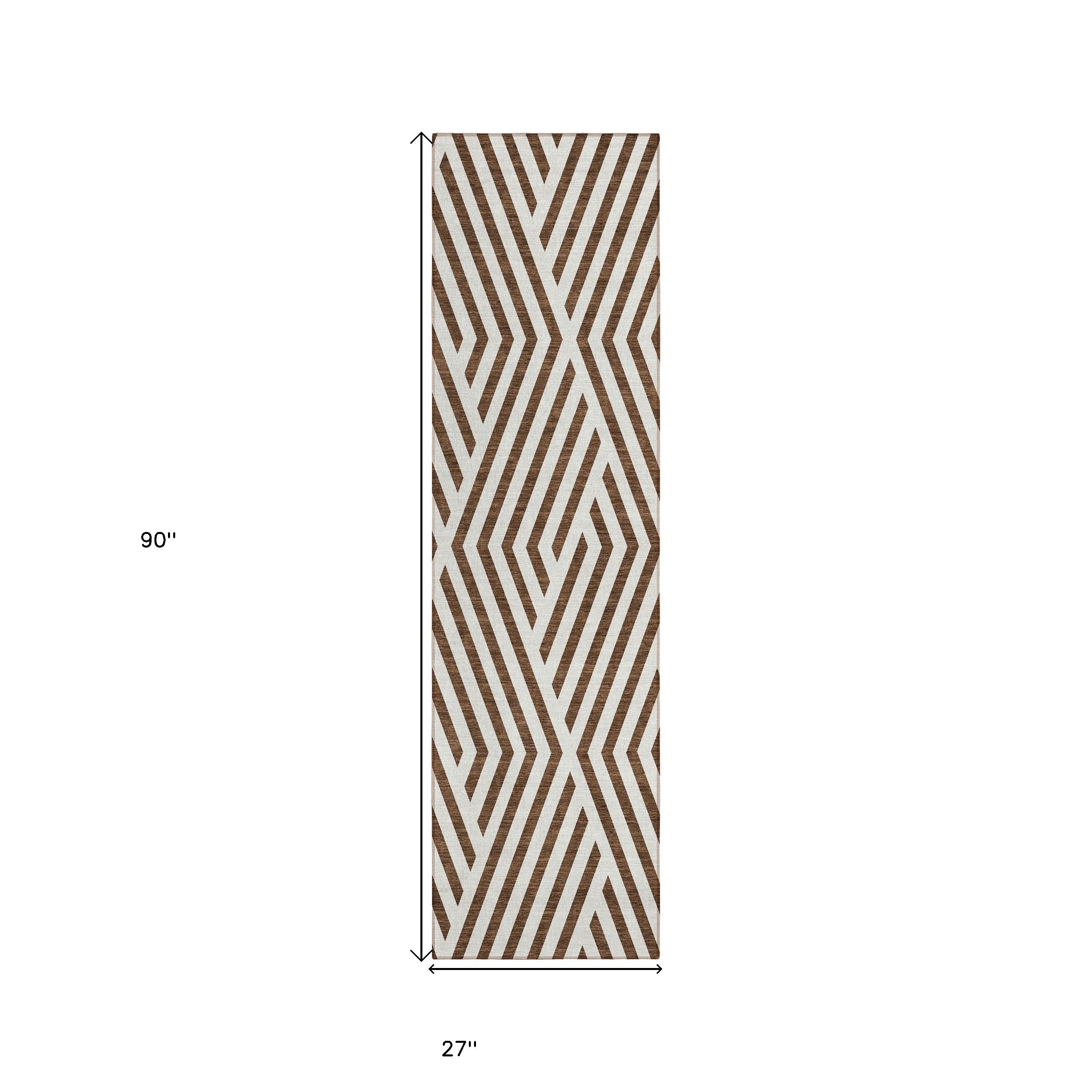 8' Runner Brown and White Geometric Washable Non Skid Indoor Outdoor Runner Rug