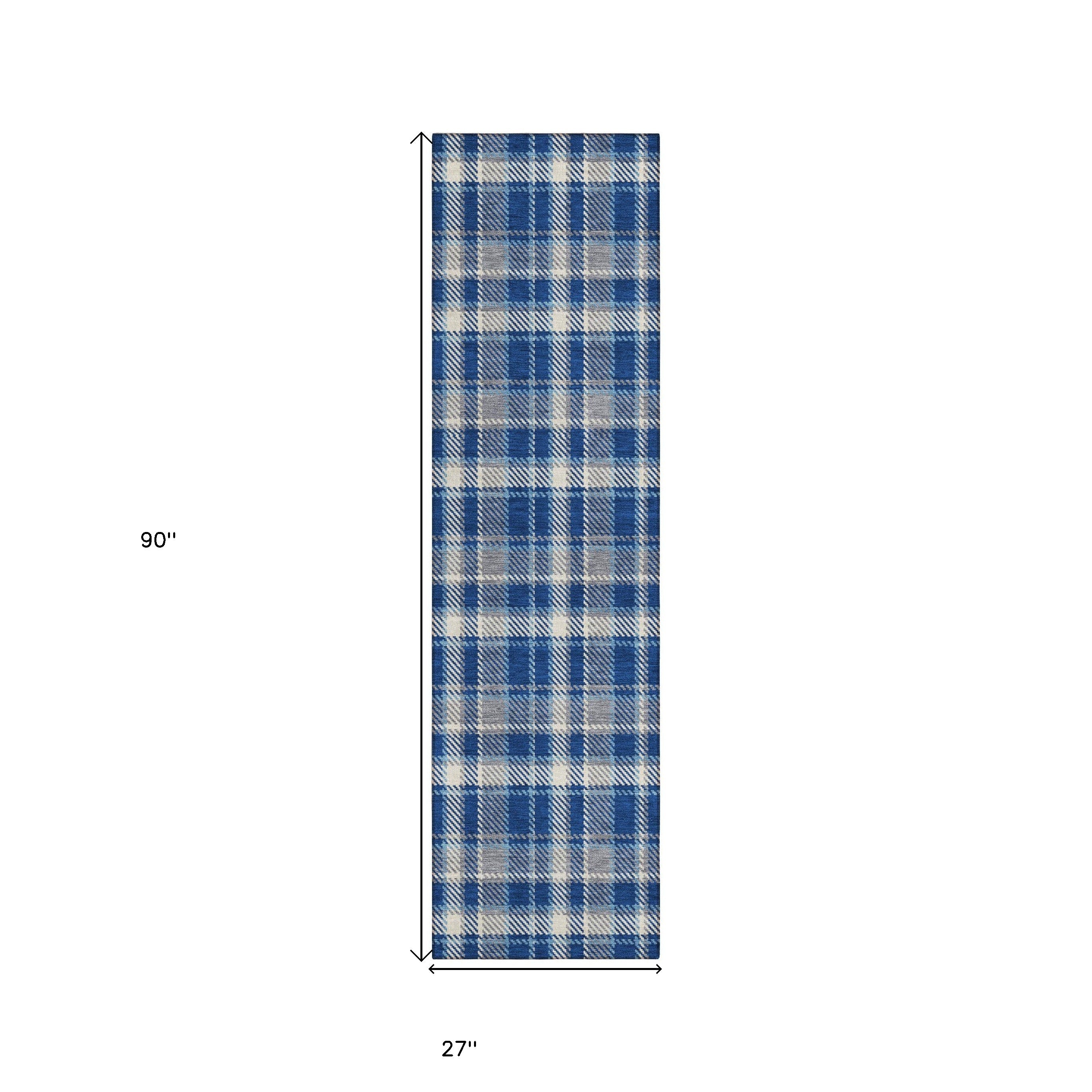 8' Runner Navy and Ivory Plaid Washable Non Skid Indoor Outdoor Runner Rug