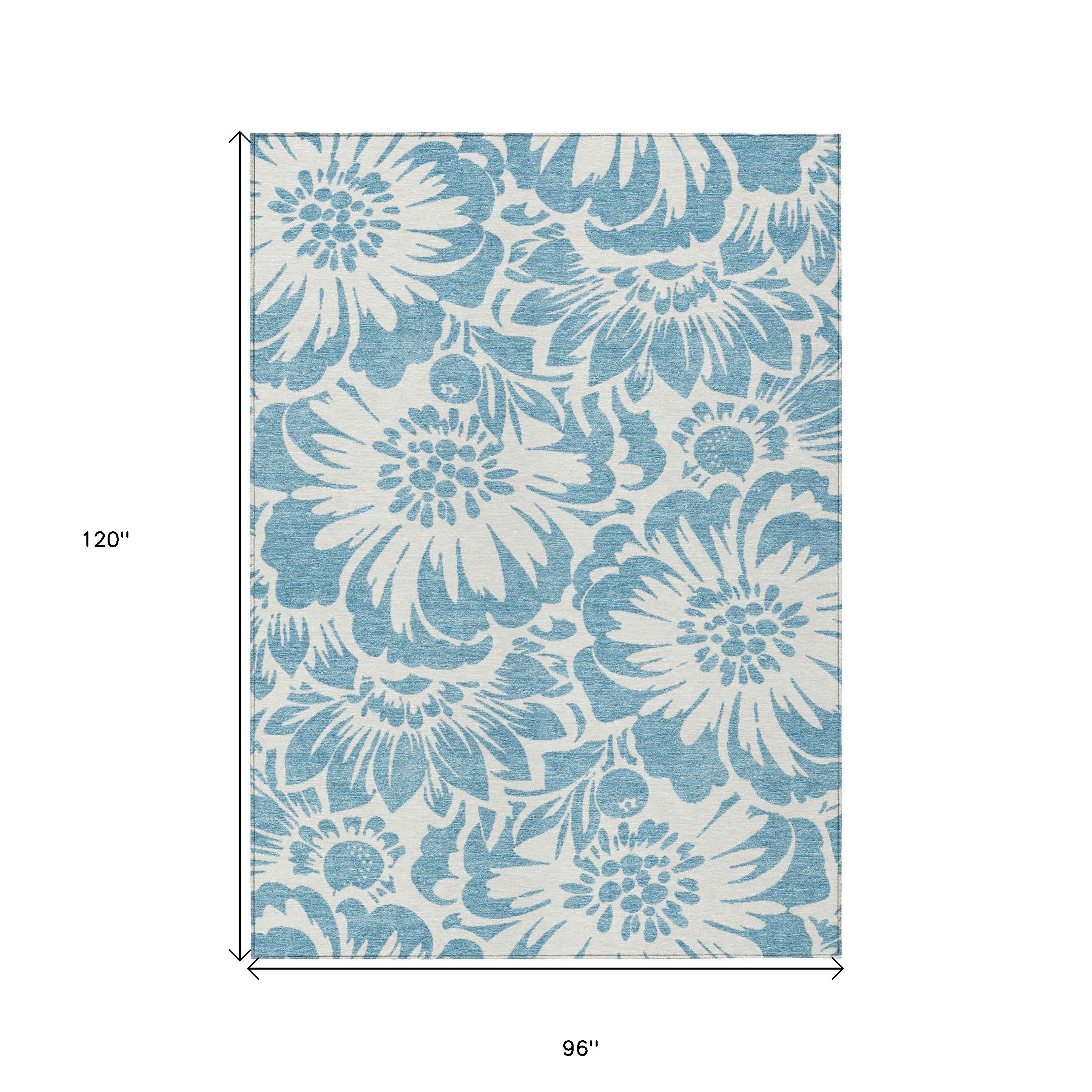 8' X 10' Denim and Ivory Floral Washable Non Skid Indoor Outdoor Area Rug