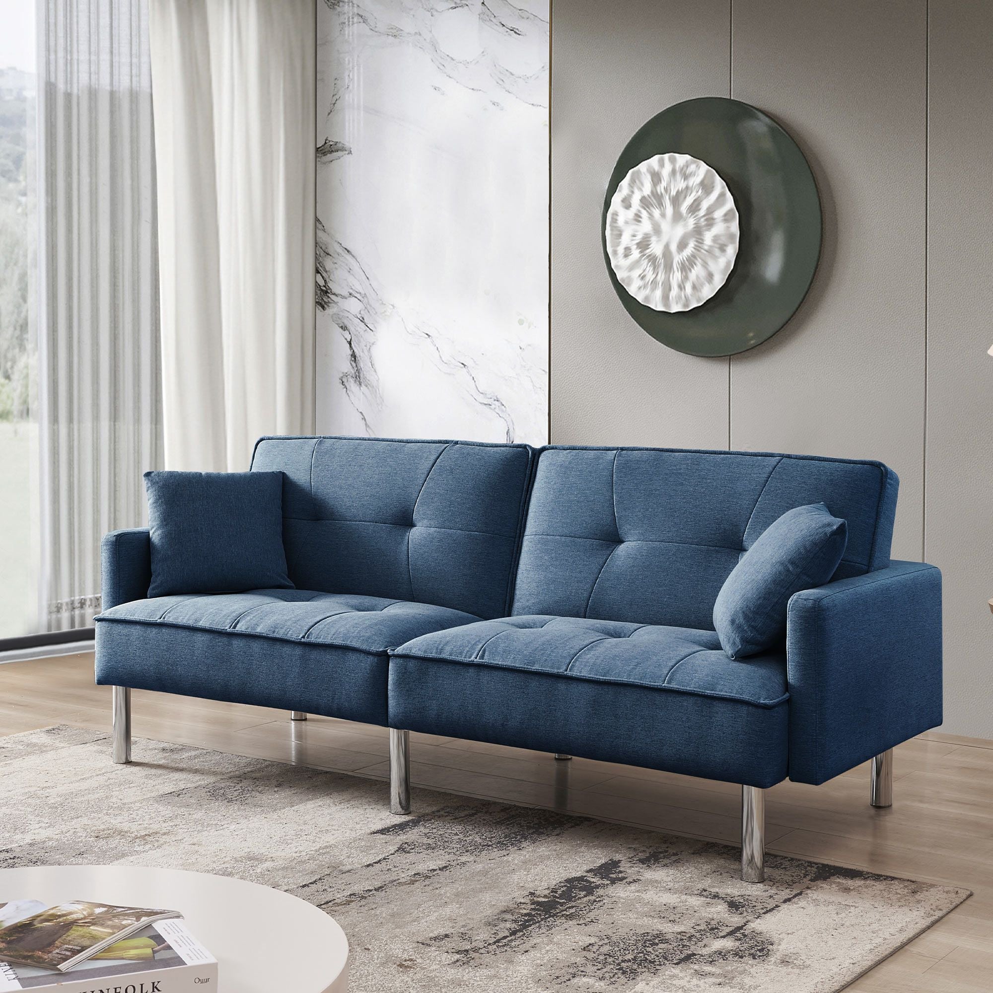 85" Blue Polyester Blend and Silver Convertible Futon Sleeper Sofa and Toss Pillows