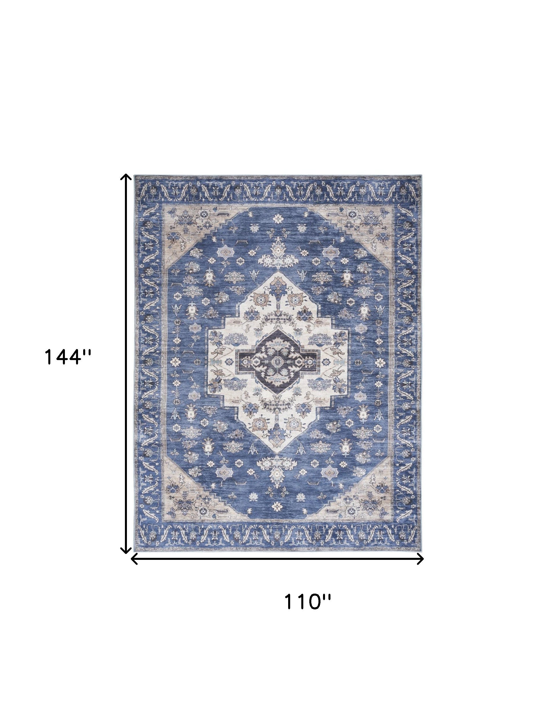 9' x 12' Blue and Ivory Oriental Power Loom Distressed Washable Non Skid Area Rug