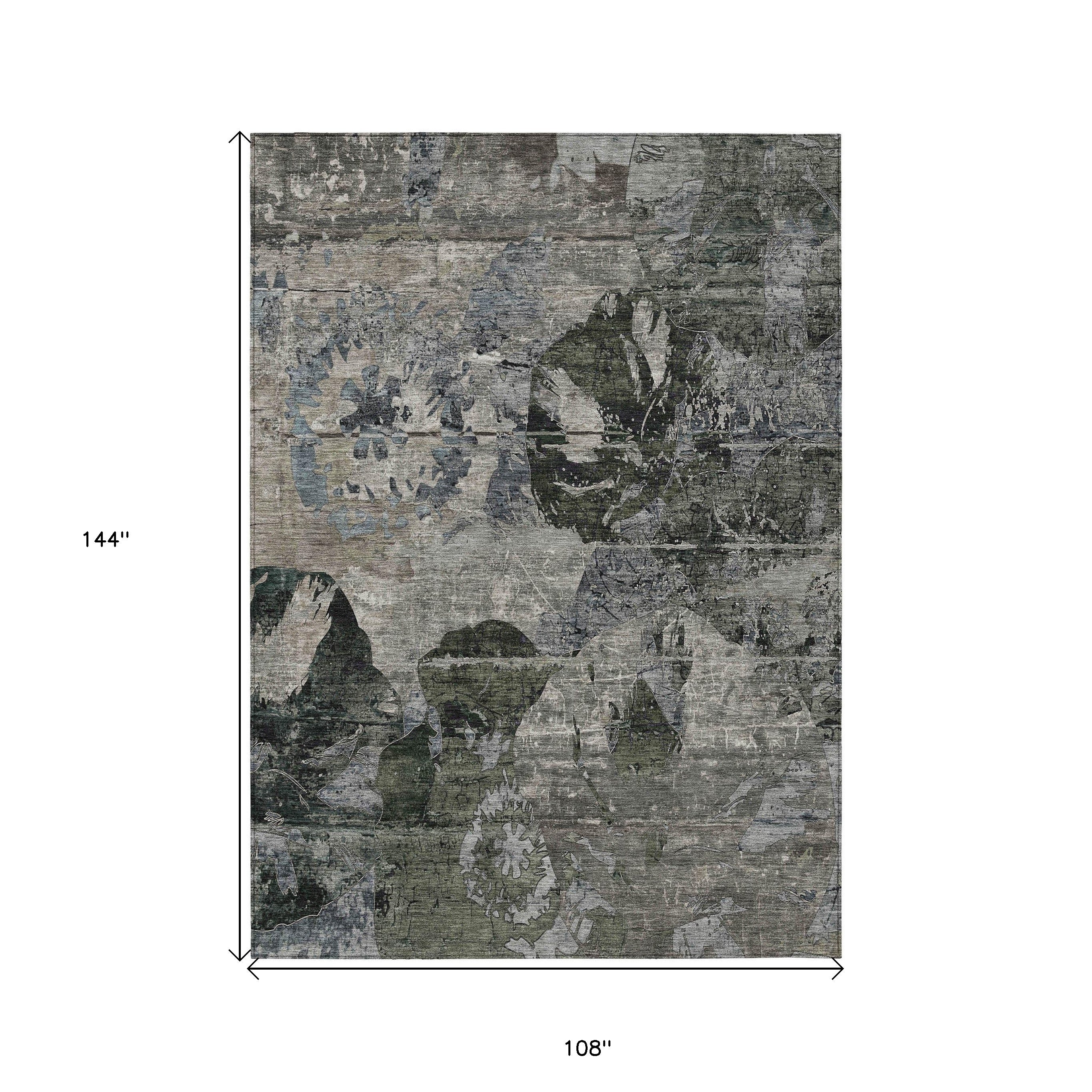 9' X 12' Gray Dark Green and Black Floral Washable Non Skid Indoor Outdoor Area Rug