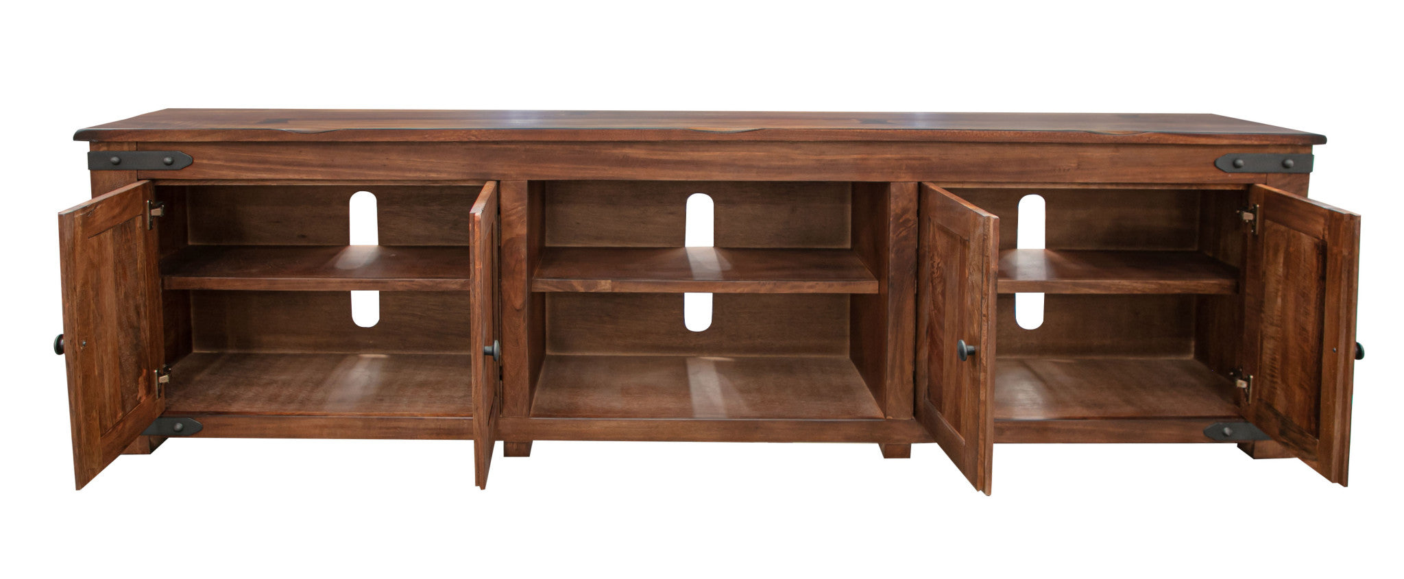 Practical, space saving, and good looking, this 93" brown solid wood cabinet enclosed storage distressed tv stand...