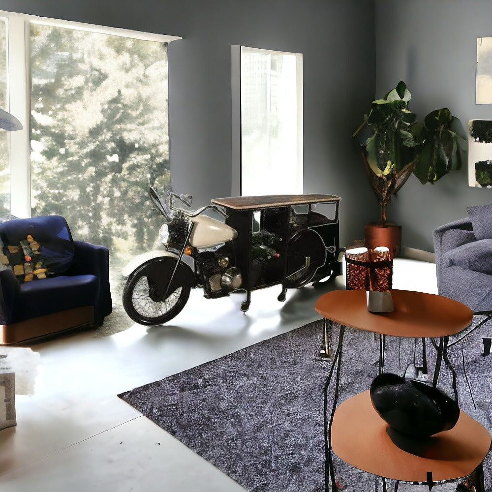 This black and white metal glider motorcycle rolling bar cart with wine storage is the perfect addition...