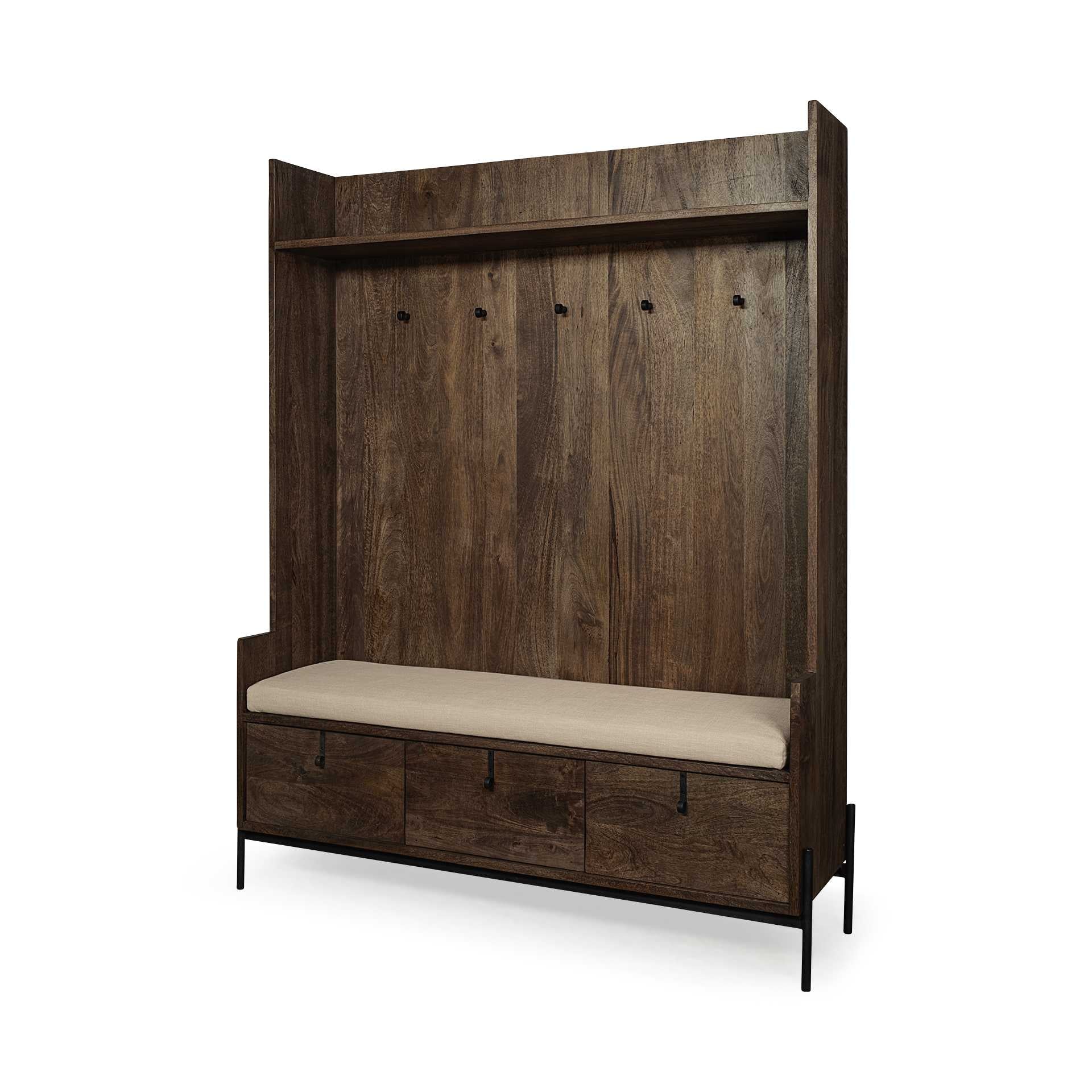 Brown Wood Cream Fabric Wrapped Seat Hall Tree With Storage