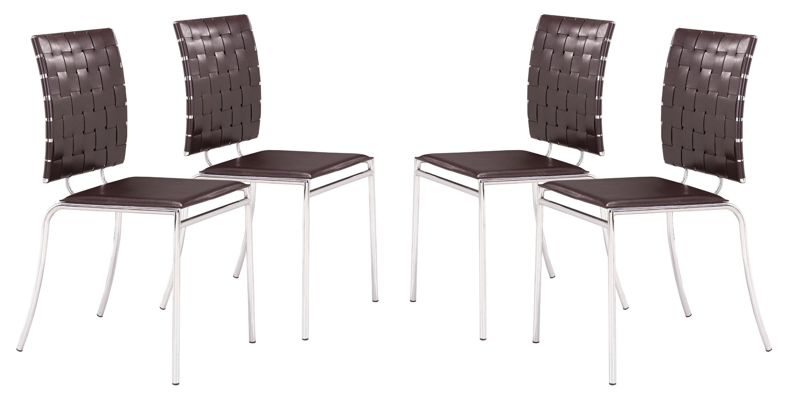 Set of Four Brown Faux Leather and Steel Modern Basket Weave Dining Chairs