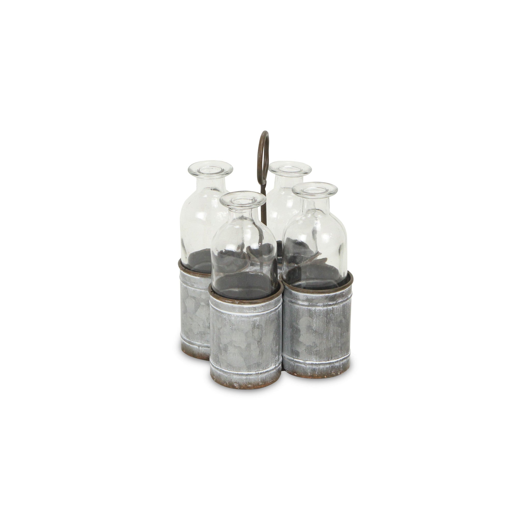 Set of Four Clear Galvanized Metal and Glass Decorative Bottles