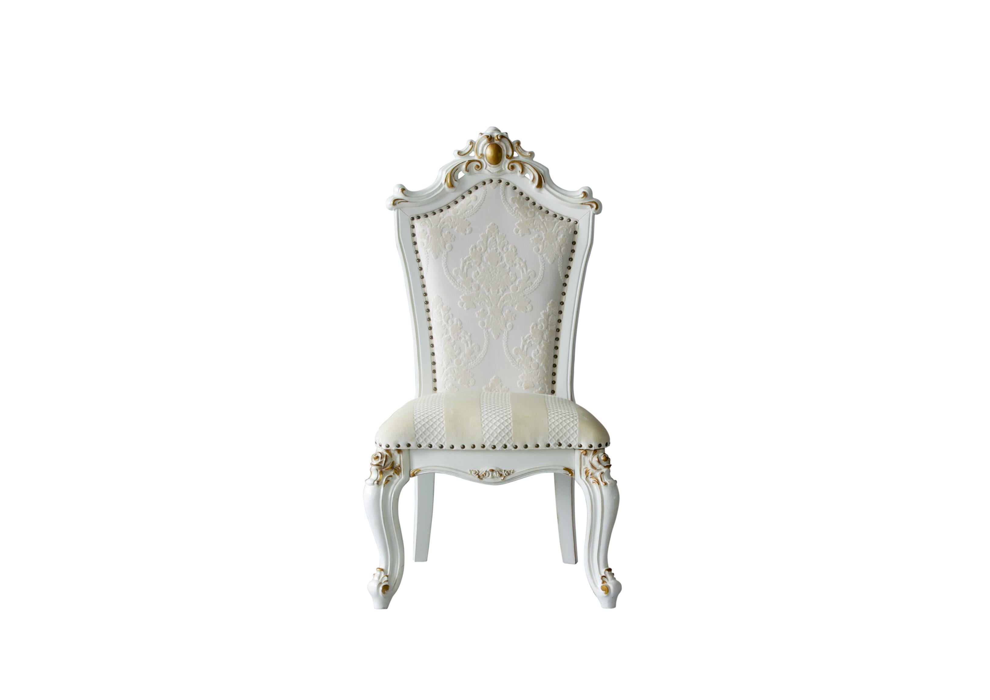 Unique and decorative, this set of two 27" beige and white faux leather damask side chair will...