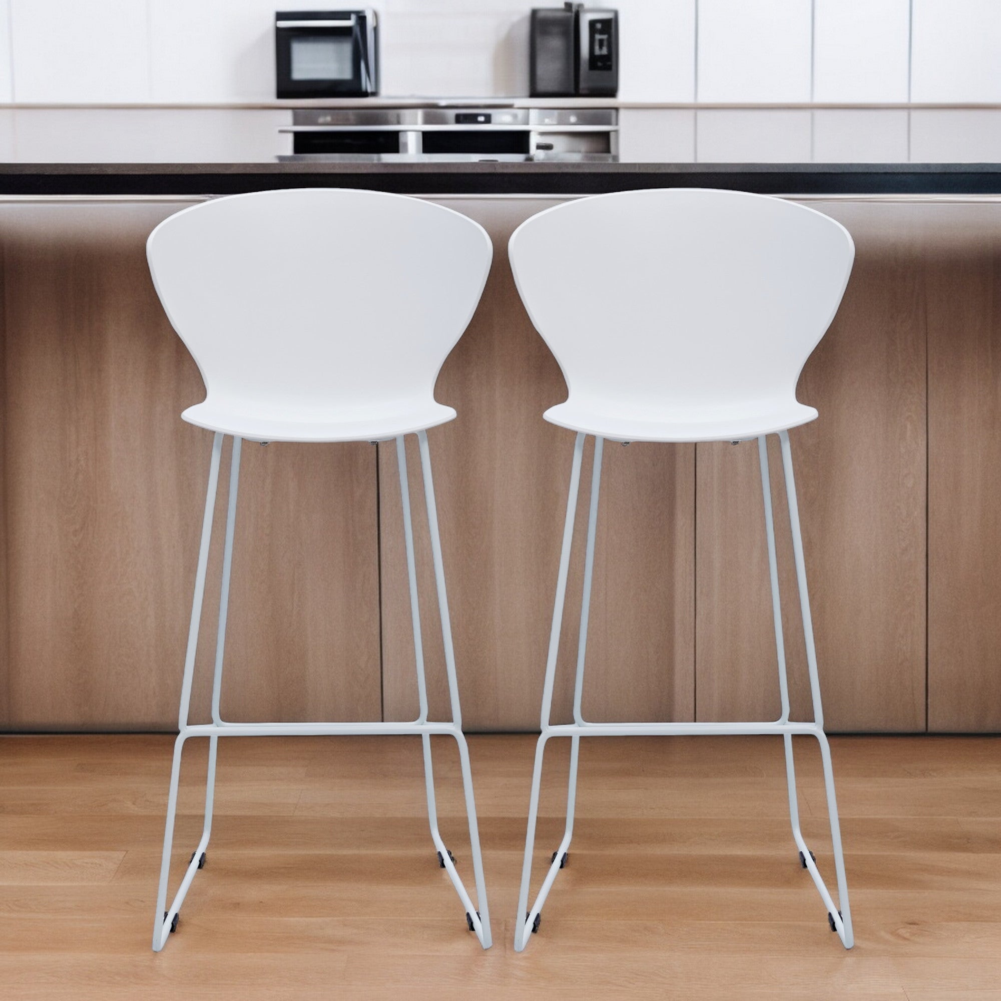 Set of Two 30" White And Silver Heavy Duty Plastic And Metal Low Back Bar Height Bar Chairs