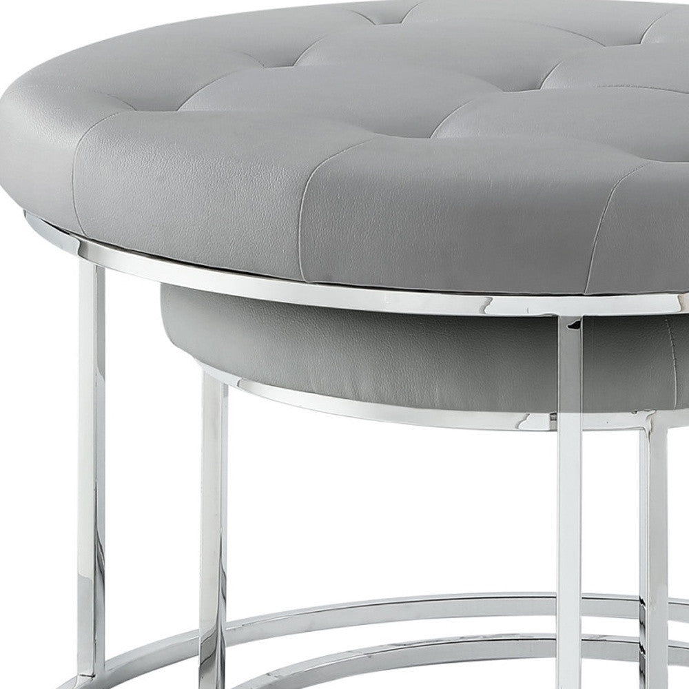 Set of Two Gray Faux Leather and Silver Tufted Round Ottomans