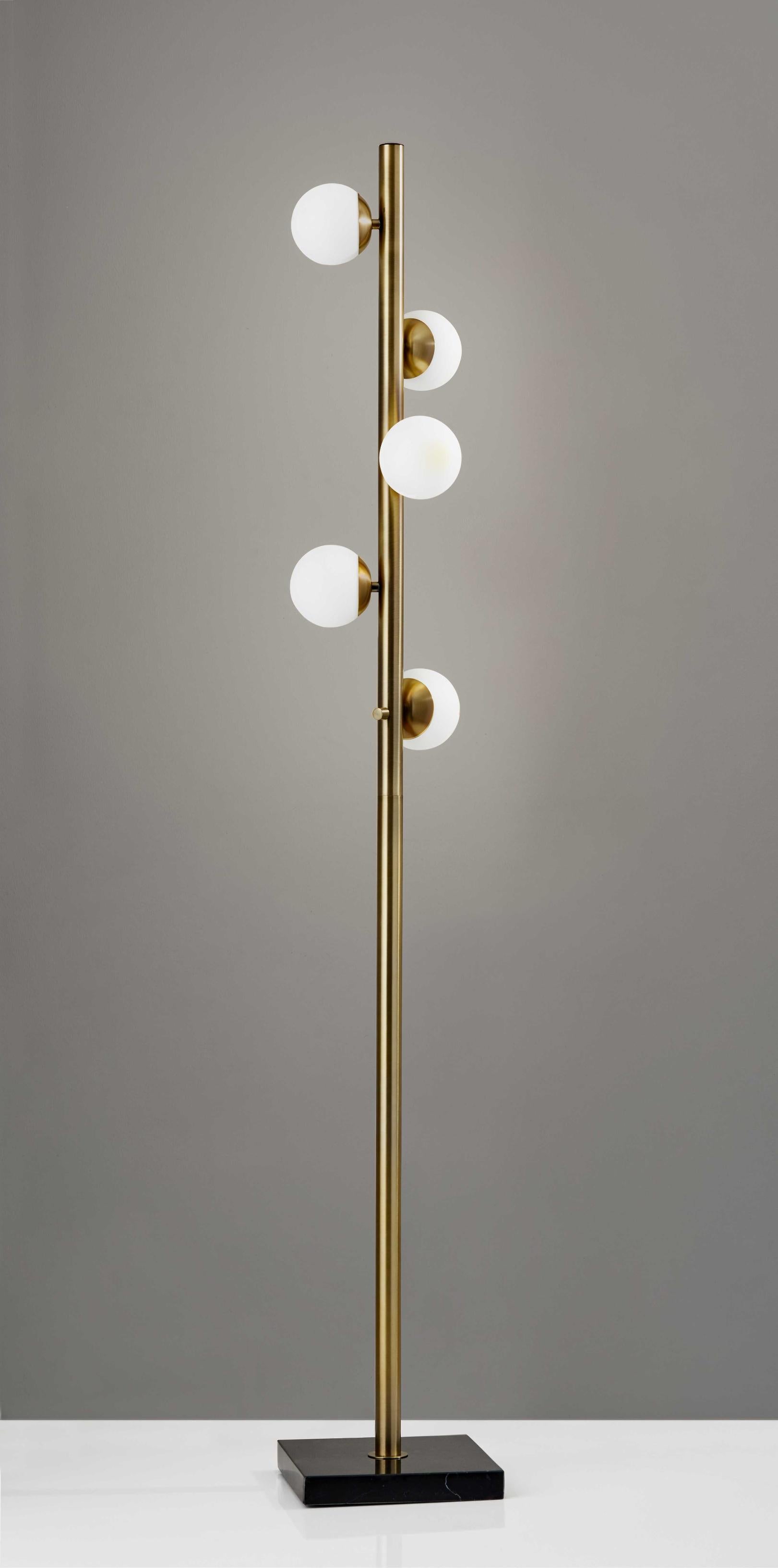 This LED floor lamp has a twisted flair. Five white opal glass globe shades are swirled along...